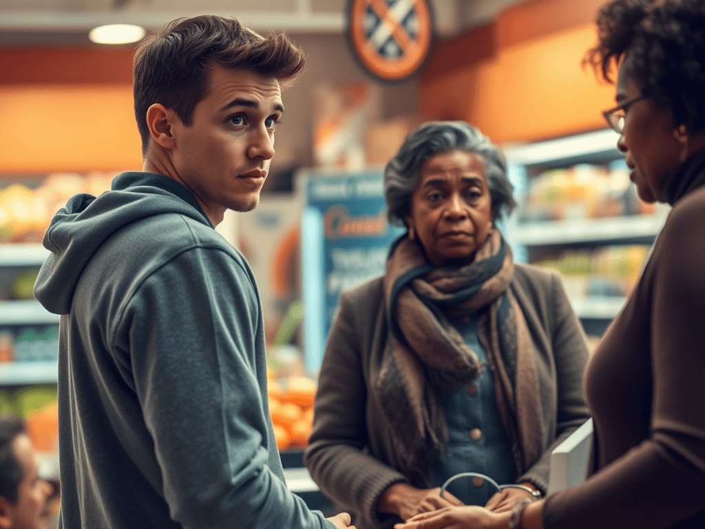 Despite his mimed protestations, there was something he could have done. He should have said to the clerk “She was here first,” and awaited his turn.